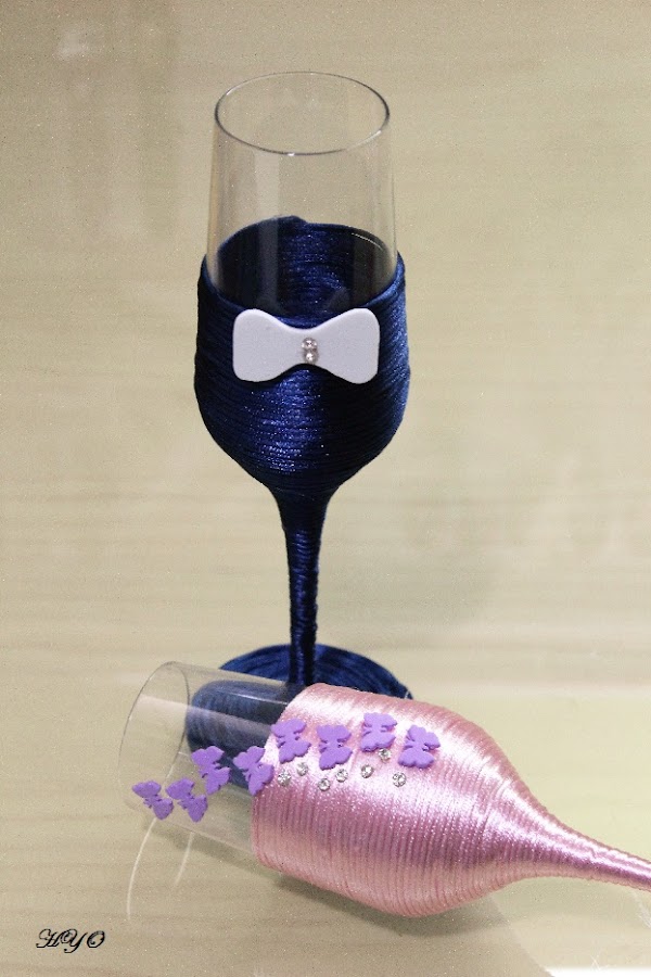 Yo he hecho un modelo para chica y otro para chico, así tenemos referentes para ambos sexos. Si la pareja de copas es para dos chicos o dos chicas os recomiendo que no sean iguales para que no resulten aburridas. Podéis utilizar colores distintos para el cordón y variar los adornos. En los chicos quedan de maravilla una pajarita, o bien una corbata, una pechera, o un cuello de camisa... Los colores que más me gustan para el cordón son el negro, el gris claro, el azul y el marrón... aunque esto es muy subjetivo. En las copas para chica lucen mucho las perlas, los brillantes, las puntillas y los tules. Y los colores que más me gustan son el blanco, el rosa y el azul claro. ¡Solo hay que dejar volar la imaginación!