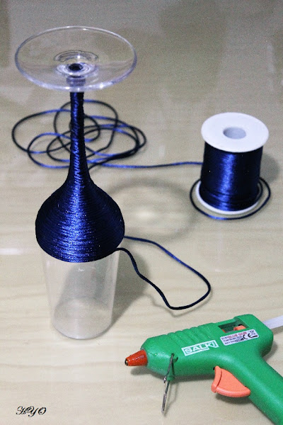 Comenzamos colocando el cordón de cola de ratón alrededor de cada copa y fijándolo con pequeños puntos de silicona. A la hora de aplicar la silicona poned muy poquita para que no se formen pegotes y pegad el cordón de inmediato para que no se seque. No es necesario poner silicona en todo el cordón, basta con aplicar en algunos puntos para que se sujete. Os recomiendo que comencéis a pegar por la parte baja del tallo de la copa y dejéis para el final la base, que es la parte más complicada por ser más aplanada.