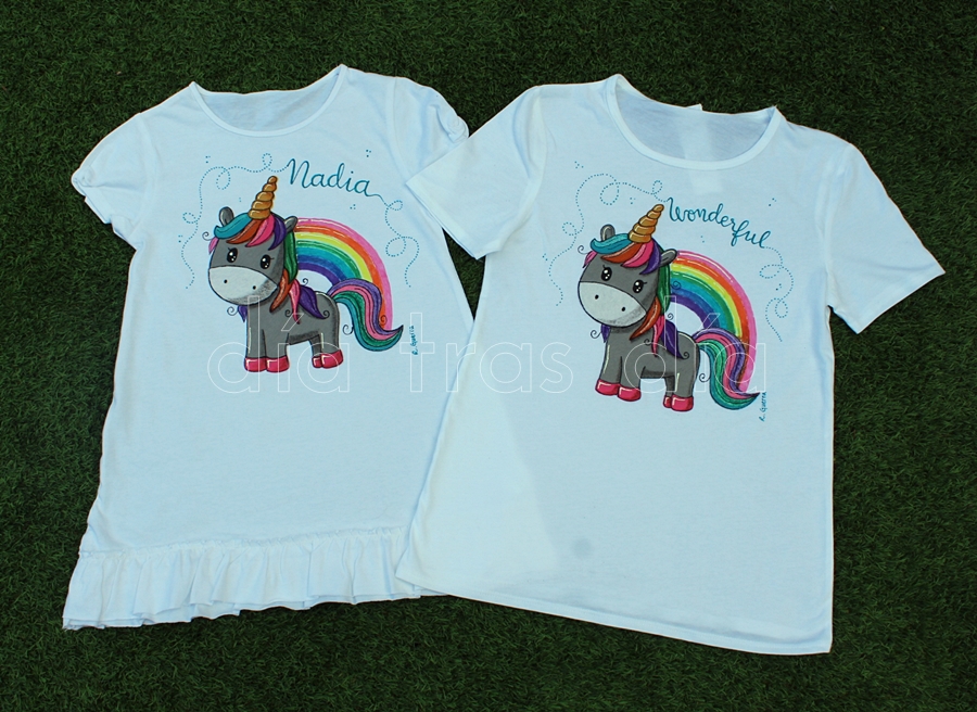 Para Nora si que lo hice en camiseta. Y la de ella no la personalicé con su nombre, ya que me pareció que quizás eso sea algo más propio para niñas más pequeñas. Así que preferí ponerle “Wonderful”, que creo que es una palabra muy de acompañar a un unicornio :-D