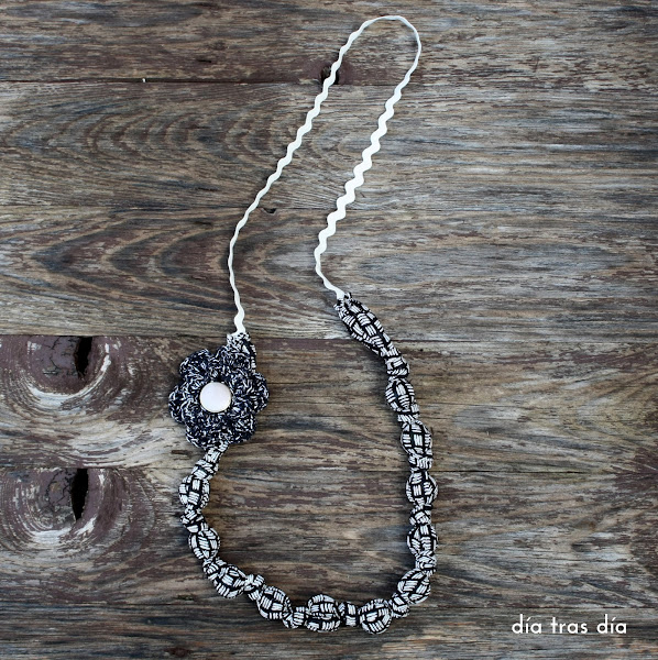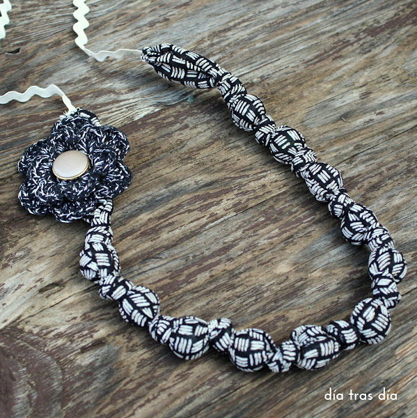 En esta ocasión Celia quiso que le hiciera un par de collares de bolas y tela, del estilo de estos que ya enseñé aquí, decorados con su correspondiente flor de crochet, uno en tonos azules y blancos y otro en color blanco y negro.