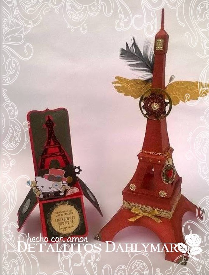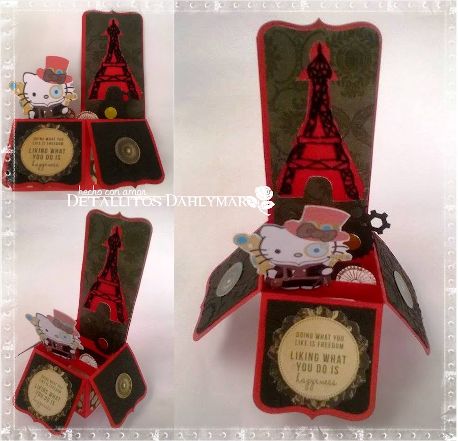 Para comenzar les enseñaré la tarjeta que realicé, una "Card in a Box" en rojo y negro con la Torre Eiffel en técnica String Art (Hilorama) y una Hello Kitty al estilo Steampunk (by KraftyNook).