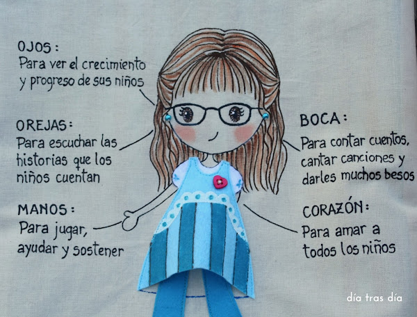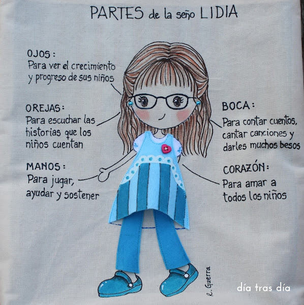 Y me envió también fotos de la seño Lidia con el uniforme del cole, para que intentara hacerla lo más parecida posible.