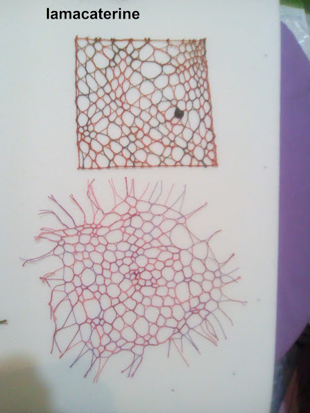 En la primera y segunda muestra no tuve tanto problema porque eran dos puntos con cartones en los que iban dibujados los puntos orientativos. Pero cuando llegue al "tul boig" (Tul loco) la cosa se empezó a complicar. ¿Como conseguir diferentes tamaños de punto guardando armonía? Me dí cuenta de que el encaje contemporáneo es engañoso y exigente. Engañoso porque parece fácil de hacer, total es un lio de puntos que aunque haya equivocaciones no se nota. ERROR. Se nota y mucho. Exigente porque pone a prueba nuestra imaginación bastante encorsetada con otros tipos de encaje. Ya elegir los colores de hilo me fue complicado porque yo soy muy extrema con los colores y cuanto mas se pegan mas me gustan. Menos mal que María estaba allí para aconsejarme y guiarme.