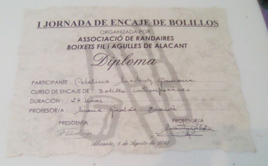 Dicho todo esto que aunque se que María no visita redes sociales y poco internet, espero que le lleguen estas palabras que no son de adulación sino de justa admisión como ya le dije a ella. La gente seguramente seguirá hablando sin conocerla pero si tenéis la suerte de que se cruce en vuestro camino no dejéis que se os escape sin hablar cinco minutos con ella, y veréis como os contagia de su entusiasmo por el encaje. Eso sí, como ella reconoce es exigente y le gusta enseñar la técnica (cosa que yo apreció muchísimo) y después cada cual que haga lo que considere oportuno pero dentro de la técnica.