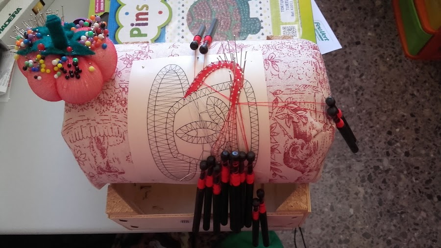 Estuve un rato haciendo encaje con el bolillero que había preparado para el viaje y que al lado de los que allí habían se veía todavía mas pequeño, eso si, era el único, jajajajajaja.