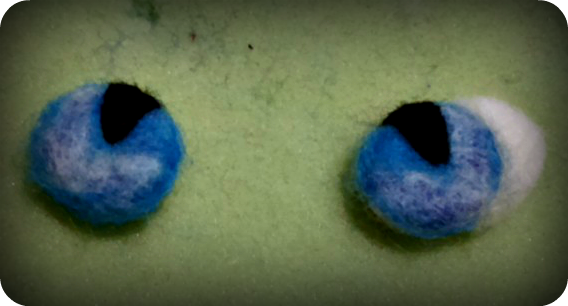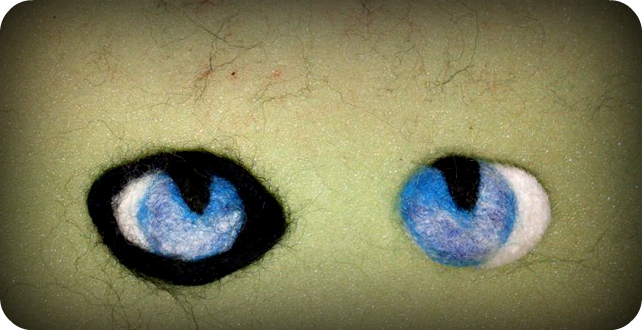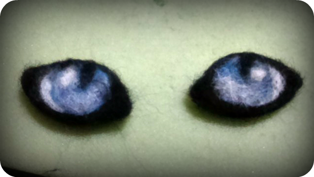 Con la pupila arreglada , el contorno del ojos definido , le voy a dar un punto de brillo a esta mirada felina con un pelín de fieltro blanco.