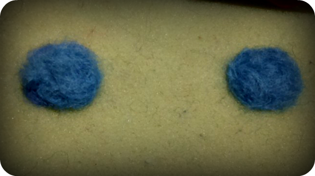 No me resisto a ponerle alguna manchita en turquesa , ( manías mías....) y con fieltro negro comenzamos con las pupilas !!! , pinchamos para mezclar fibras