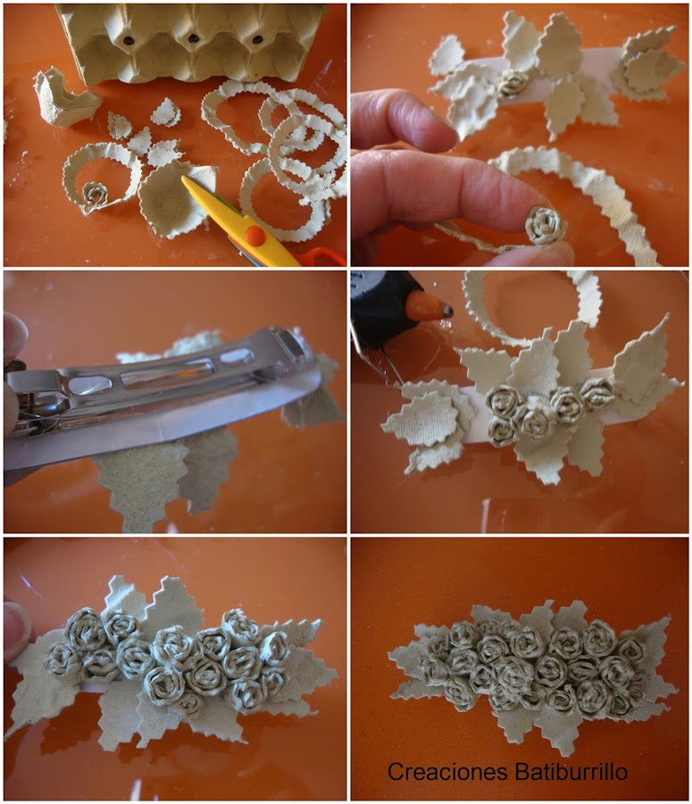 Por otro, cortamos de arriba abajo espirales finas como veis en la foto. Con ellas, vamos enrollando el cartón para formar pequeñas flores y lo fijamos por abajo con una gota de silicona.