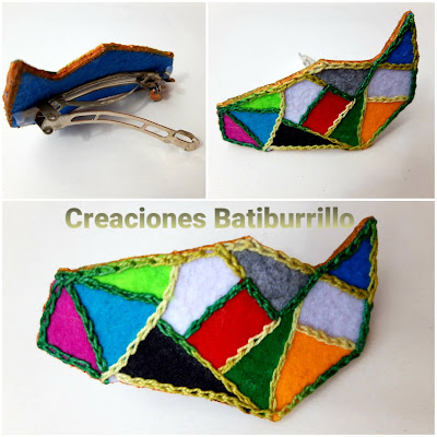 Recuperando trocitos de fieltro, los pegamos en mosaico sobre base de fieltro y entramados con una costura de cadeneta (hilo de bordar en colores degradados).
