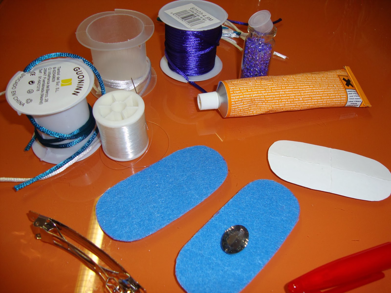 Materiales: fieltro, cordón (en este caso unos restos de cola de ratón morado y blanco que tenía de hacer pulseras), un abalorio central ovalado(que como era reciclado, me resultaba muy brillante y no me convencía, transformé en blanco con tres capas de esmalte de uñas blanco), abalorios pequeños, aguja e hilo de nylon transparente, pegamento, una base de pasador de pelo y pistola de silicona para el fijado final.