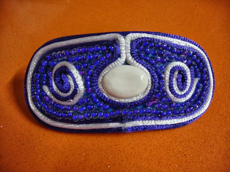 También pegué en medio el abalorio escogido para el centro y fui pegando los cordones formando un dibujo a su alrededor y por todo el contorno. A ambos lados otras dos filigranas en forma de caracol con los dos cordones a la vez, fijadas también con hilo para evitar que se abriesen.