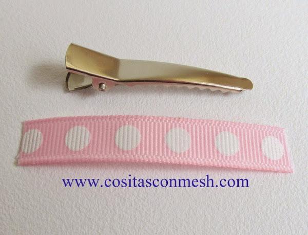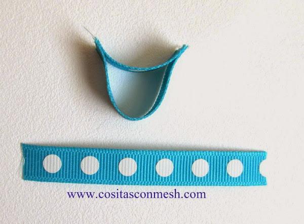 Entonces, cortamos listón de 5.5 cm x 1 cm de ancho, para forrar el pasador.