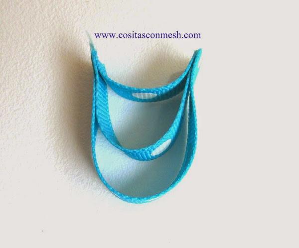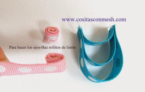 6.-Ahora hacemos la base para pegar los ojos del búho, es muy fácil, hacemos rollitos con listón y lo iremos pegando con silicon