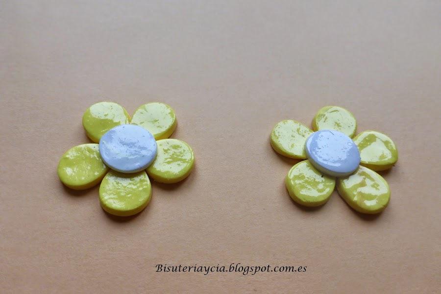Lo primero que tenemos que hacer son las flores, para hacerlas amasaremos la arcilla y con un molde para galletas cortaremos las flores, con arcilla de otro color haremos el centro. Después las pondremos en el horno unos 15 minutos y las dejaremos enfriar, cuando ya estén frías les aplicaremos un poco de barniz.