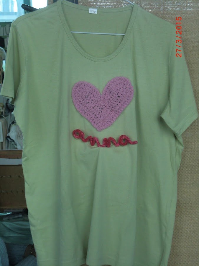 La palabra "love" está hecho de gusanillo tejido, con telar circular pequeño, no va con la camiseta pero ahí destacaba mejor. También hice nombres de personas, les puse un alambre en su interior y moldeé, luego los encolé para que se quedaran tiesos, con la intención de que sirvieran para decorar sin desmoronarse. En un estante o pared, o apoyado en un retrato quedarían genial.