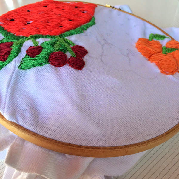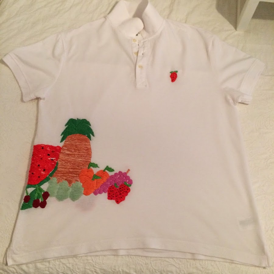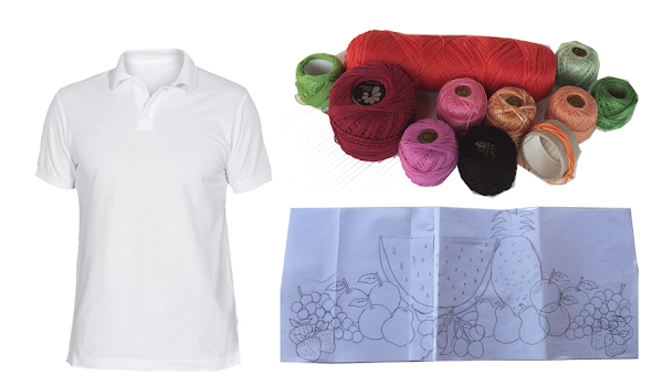 I have drawn different types of fruit in a paper, and once this sketch has done, move the template to the polo in the position where we want to place our drawing, I chose a strawberry in the chest, and the principal drawing is from back to front.