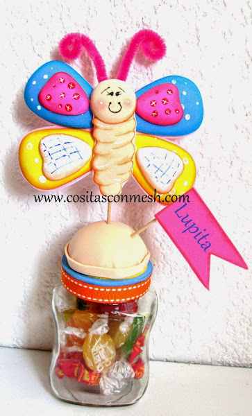 Y yo claro feliz de poder ayudar con una manualidad en la que estemos reciclando ,y darle un nuevo uso como " Dulcero" ,elegí hacer una figura de mariposa en foamy y ponerla como parte decorativa del frasco,podemos poner en el dulcero una banderita y escribir el nombre de la cumpleañera o el nombre del invitado.