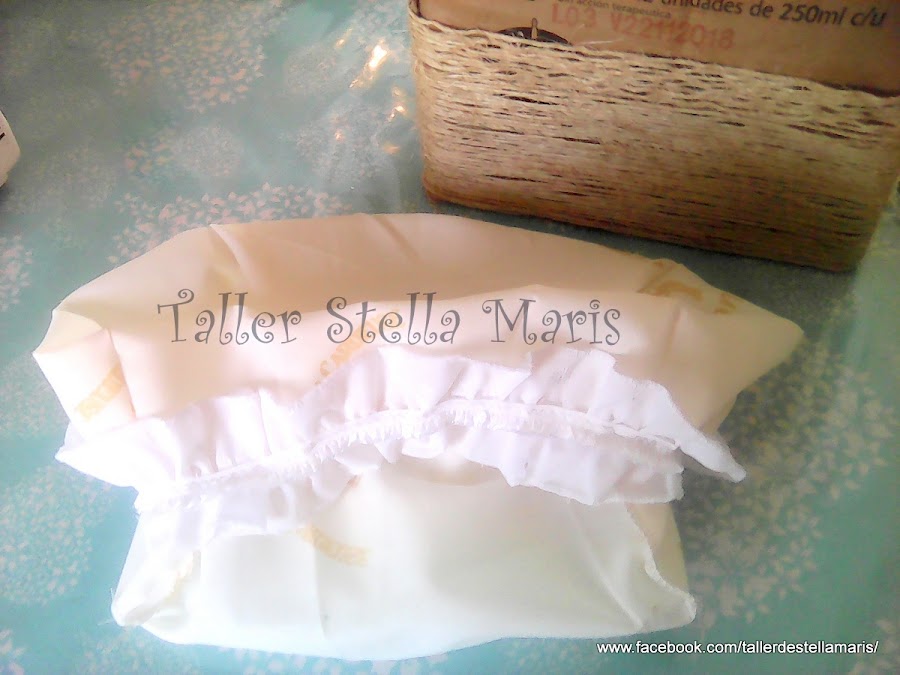 Para ajustar la funda a la caja, le cosí una puntilla elástica al centro del volado.