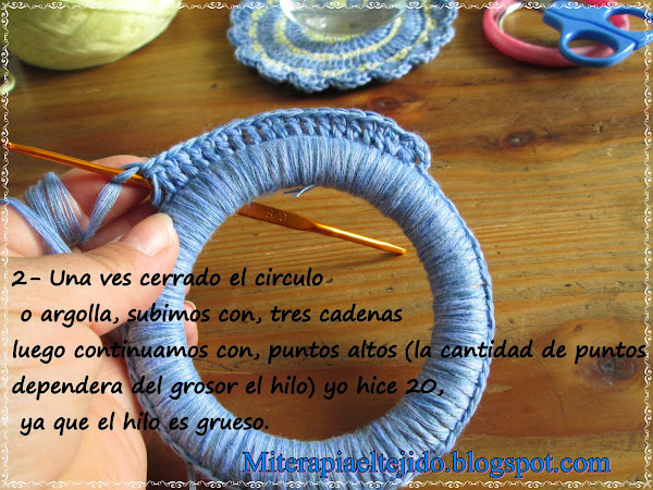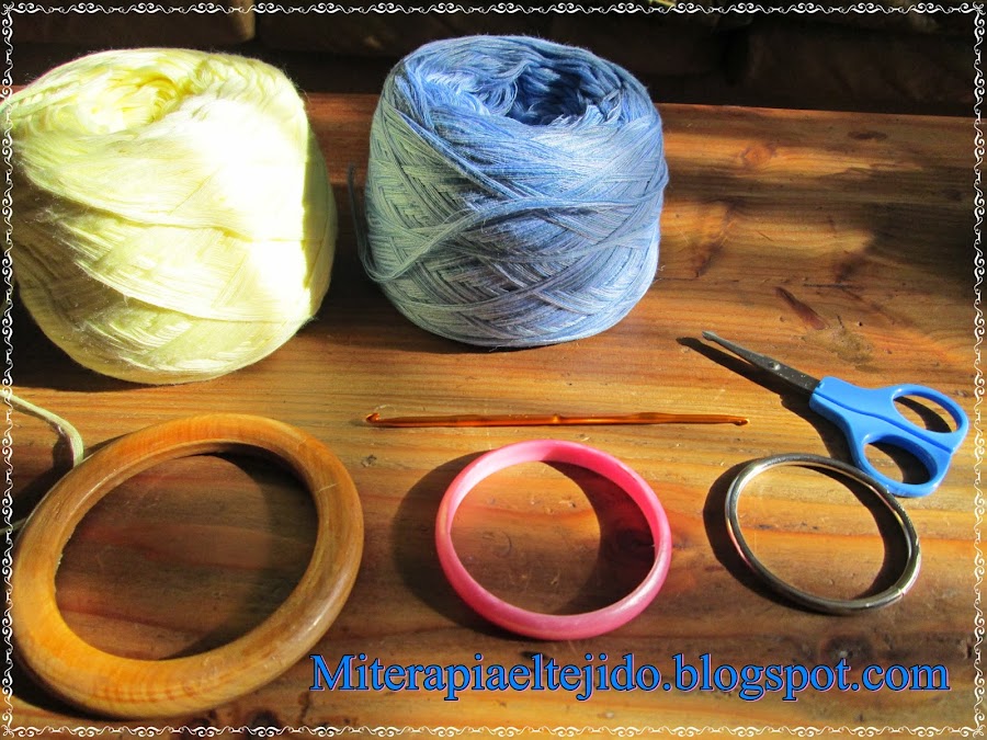 Necesitamos: una argolla, hilo o lana como gusten tijera y crochet. La argolla puede ser metálica de madera o plástica.