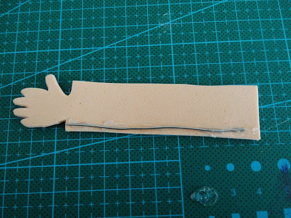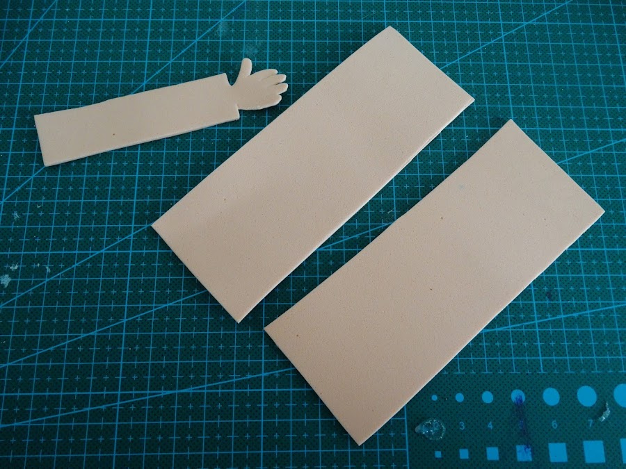 Para las manos, cogemos un patrón y lo recortamos, con ayuda de un palo de brocheta lo marcamos en la goma eva y recortamos
