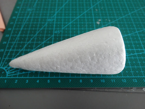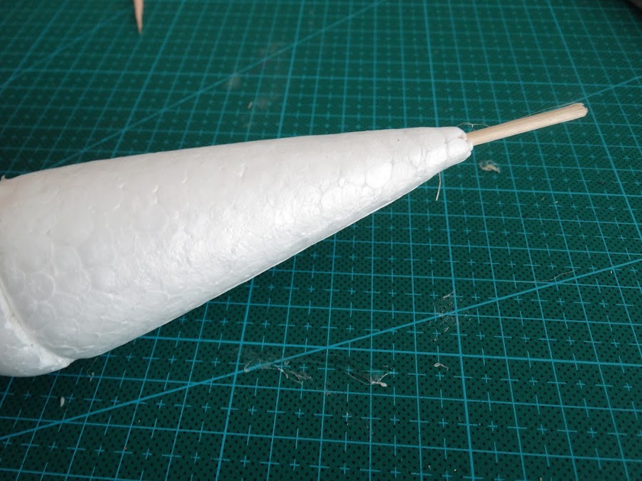 Los pegamos entre sí y ponemos un trozo de palo de brocheta en la punta del cono para después poder unirlo con la cabeza