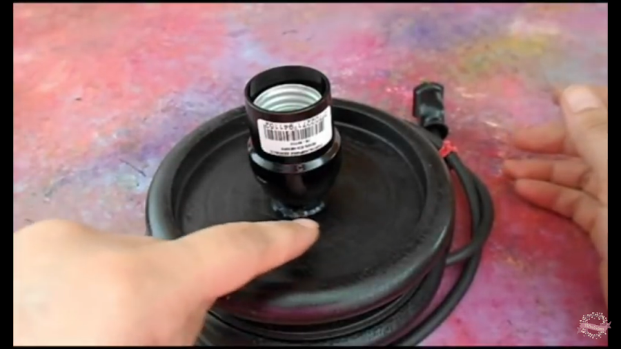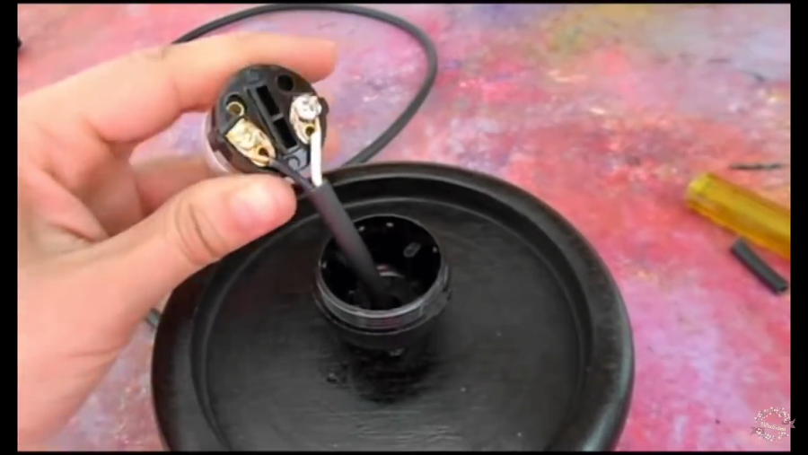 En este paso introducimos la base del porta bombillo por el cable y hacemos unas orejitas a los cables que sacamos y enroscamos el cable negro en el tornillo dorado y el blanco en el tornillo plateado, aseguramos los tornillos.