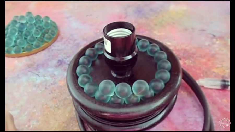Colocamos la última canica, limpiamos con la silicona líquida y listoooo, hemos terminado nuestra lámpara.