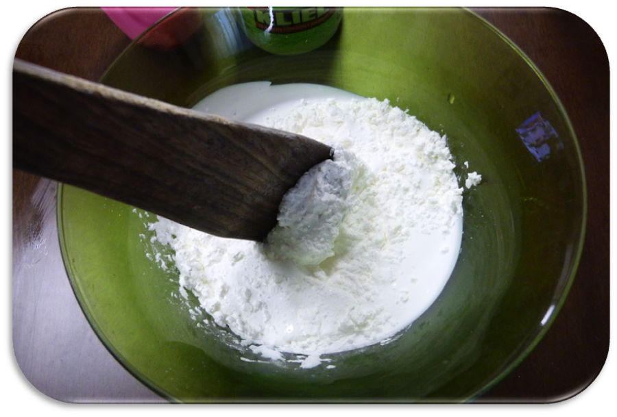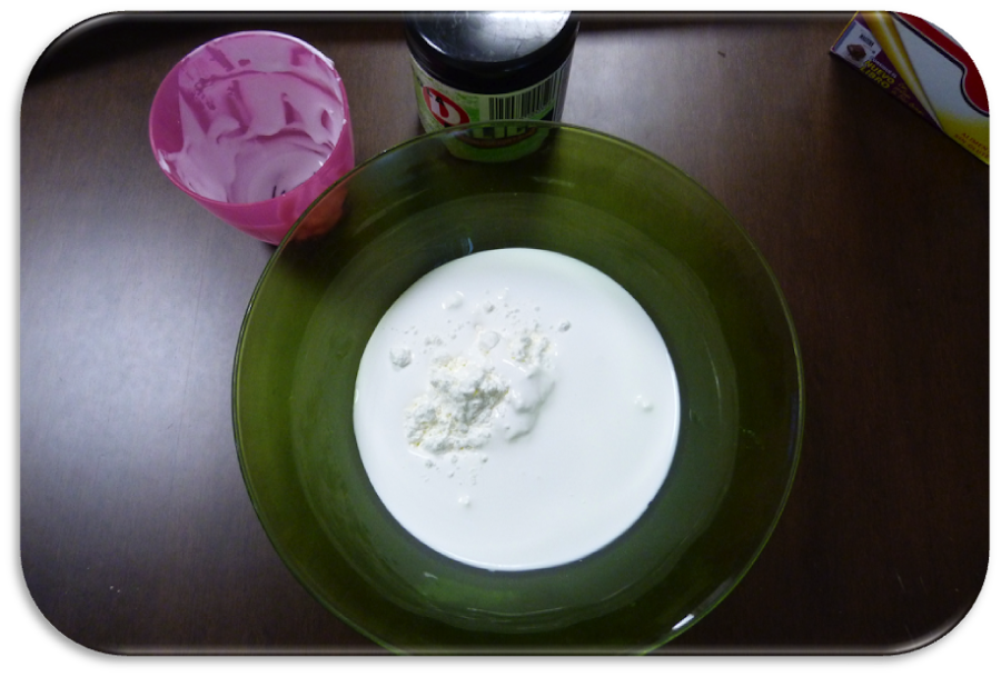 2. Se pone otro vaso de cola (tiene que ser la misma cantidad de harina y de cola).