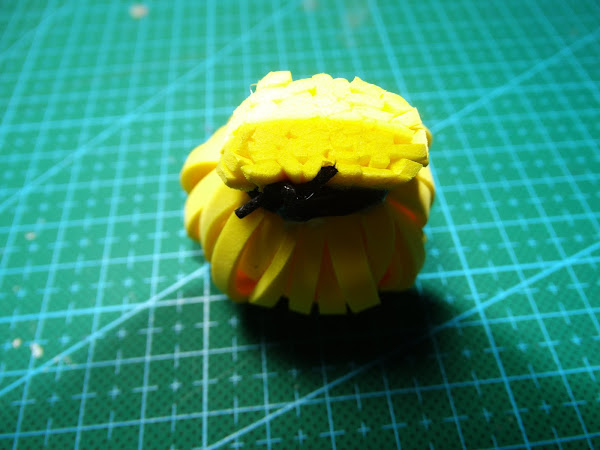 Para la parte de atrás, procuramos que todas las puntas queden lo más juntas posible pero sin que abulten demasiado, ya que será donde peguemos después el moño, algo así
