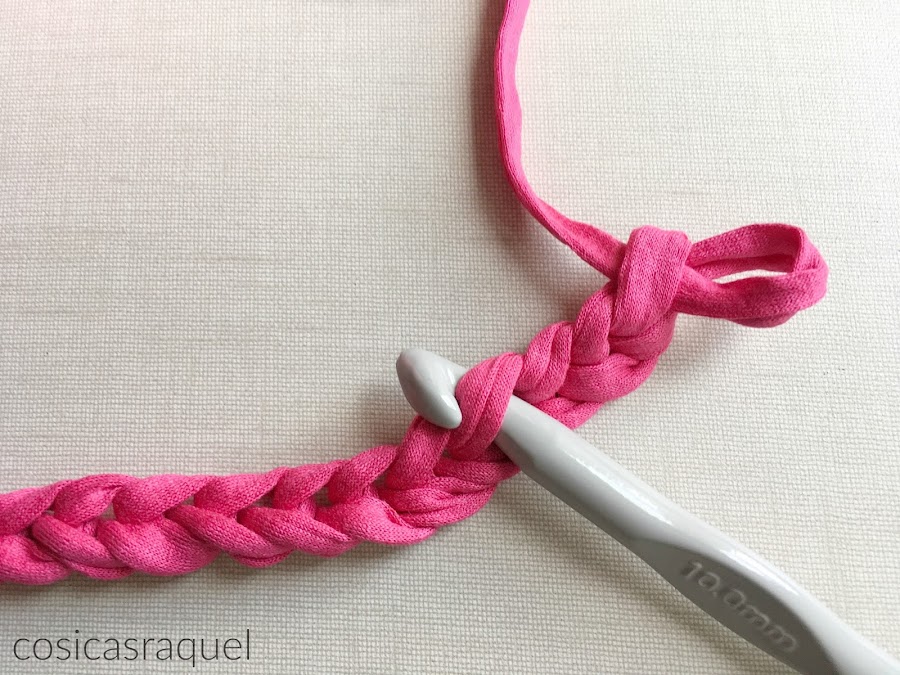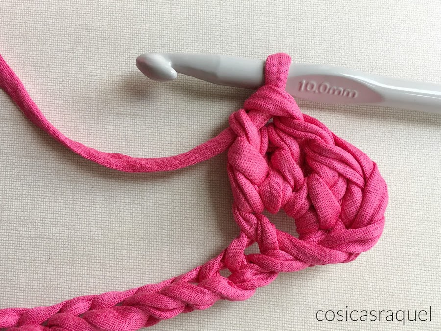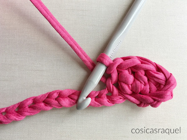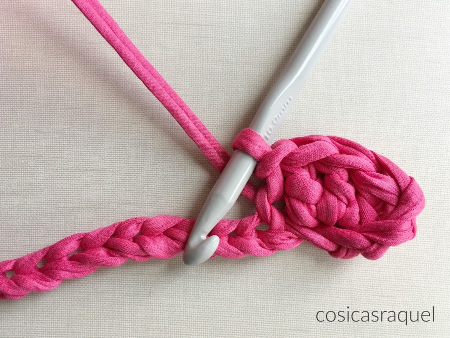 - Empieza en la tercera cadeneta desde el ganchillo ,donde te marco, haciendo 3 puntos altos ( las primeras cadenetas cuentan como el primer punto alto).