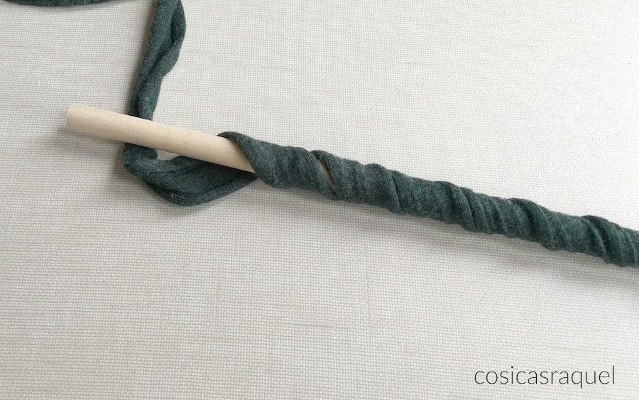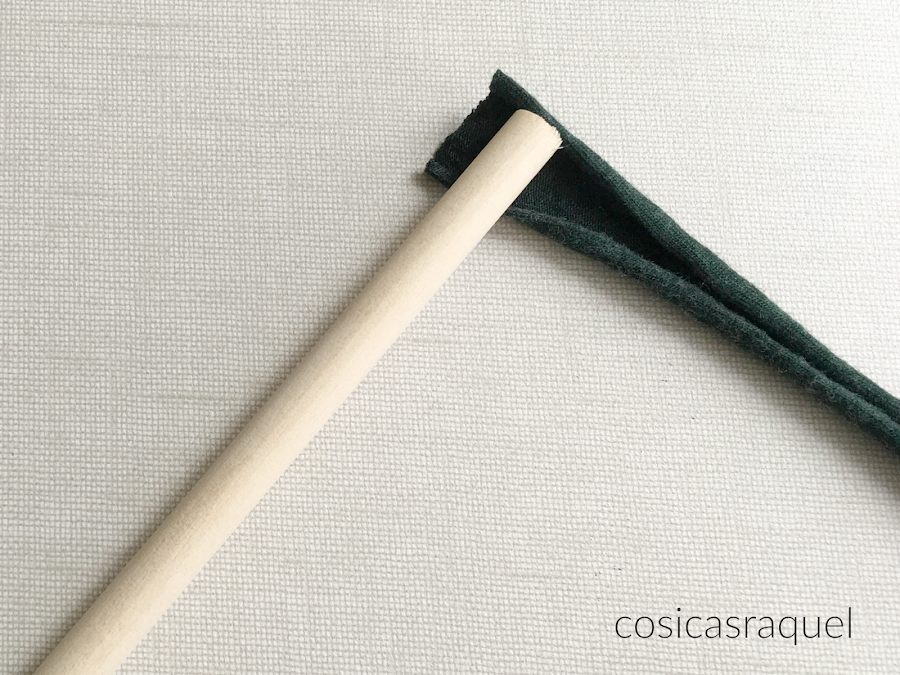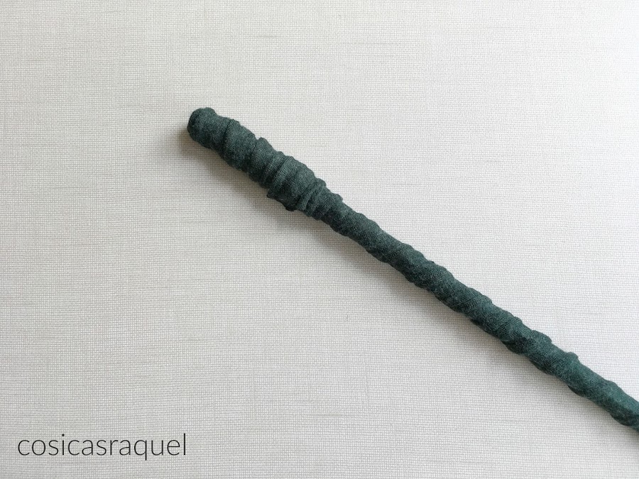 - Ahora aplica el pegamento en el palo y ves enrollando el trapillo verde alrededor , en la parte final da unas cuantas vueltas más para abajo para darle un poco de relieve.
