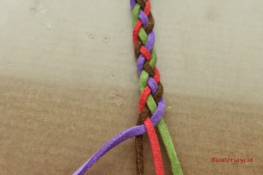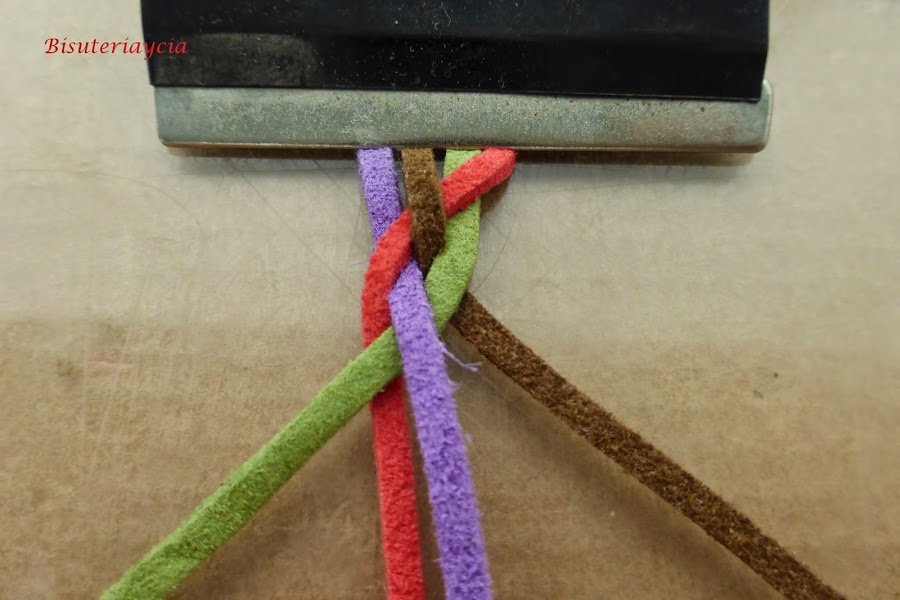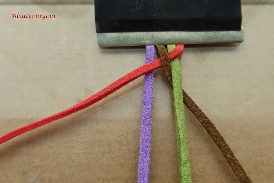 El último paso sera coger el hilo que nos quedo a la izquierda, en mi caso el violeta, y pasarlo por debajo del hilo rosa.