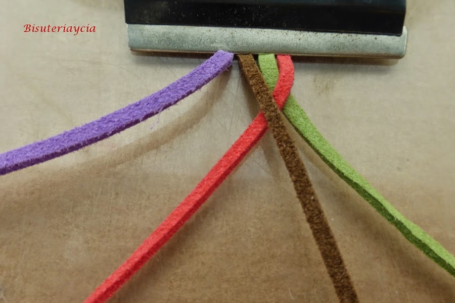 Cortaremos 4 hilos de los colores que mas nos gusten y los fijaremos para que no se nos muevan.