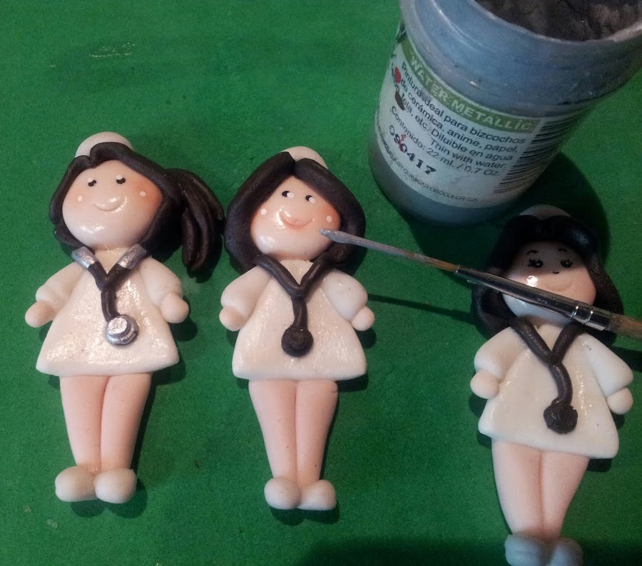 -Porcelana fría teñida con pinturas al frío o acrílicas, de los colores rojo (para la cruz), plata (para el estetoscopio), piel, negro y blanco.