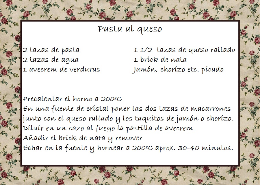 2 tazas de pasta, 1 1/2 taza de queso rallado, 2 tazas de agua, 1 brick de nata, 1 avecrem de verduras, jamón/ chorizo picado
