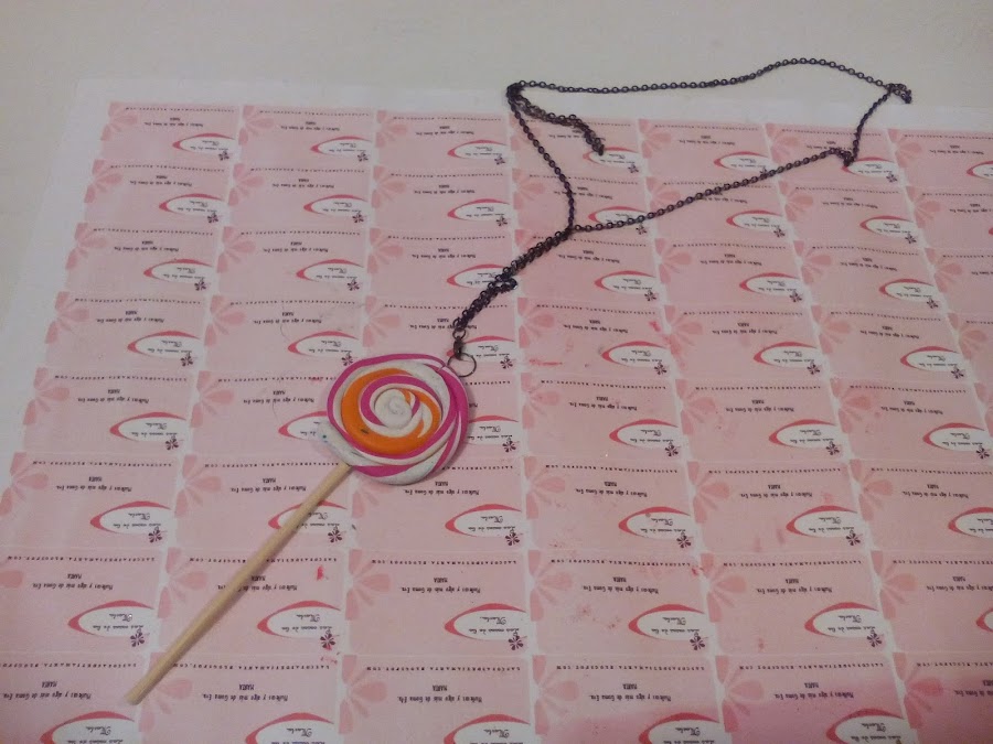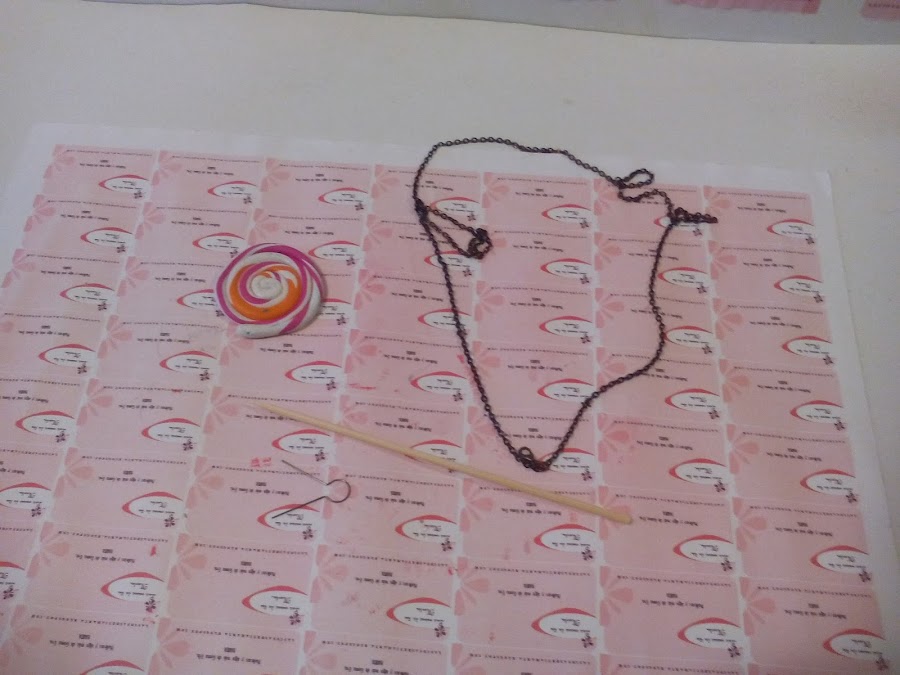 7. Colocamos la cadena, argolla y palo. Ya tenemos nuestro collar terminado.