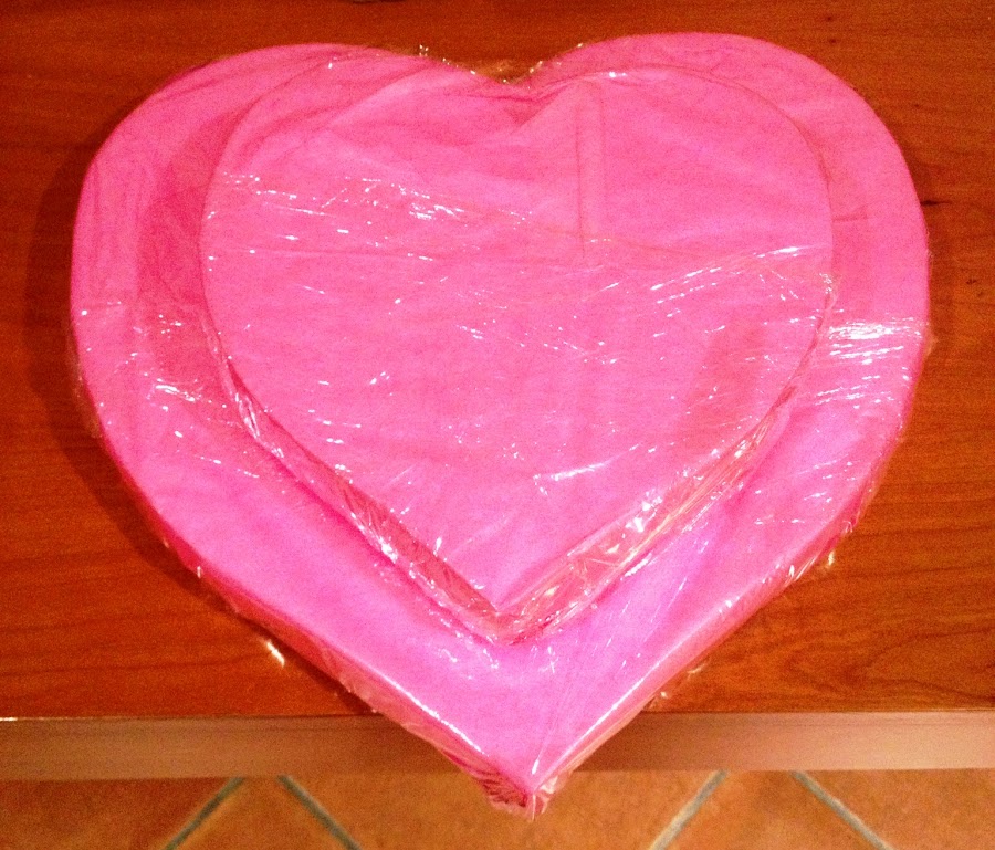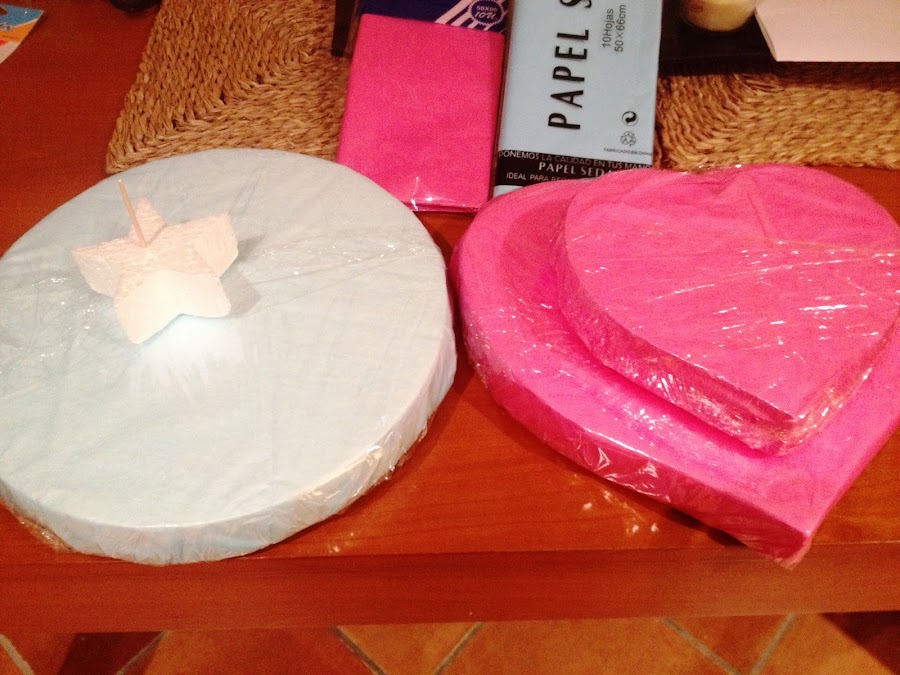 Si nuestro porex no tiene forma de corazón lo cortaremos con un cúter o cuchillo para darle la forma deseada (si no sois muy buenas dibujantes podéis imprimir una plantilla y dibujar encima del porex el corazón. Luego ya sería cuestión de ir cortando por la línea). Yo hice dos pisos, o sea, un corazón más grande que el otro. Ahora forraremos el porex con el papel de seda y lo fijaremos con el adhesivo. Haremos lo mismo con el film transparente. Si habéis hecho dos pisos como yo, forrar los 2 y ya podéis montar el piso pequeño encima del grande y fijarlo con un palillo de brocheta en el centro para que no se mueva.