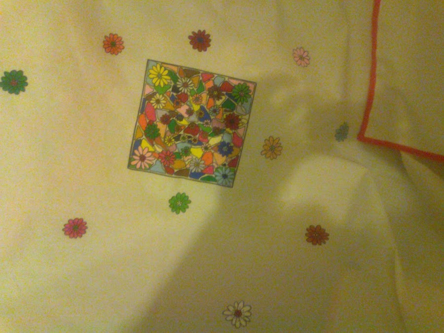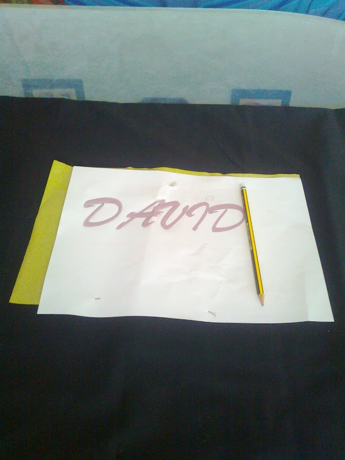 1º paso: Copiar la letras o dibujos con papel de calca, yo utilicé calca amarillo, ya que la tela era negra y no se veía. Centrar el boceto y sujetarlo con fijo, o con alfileres.