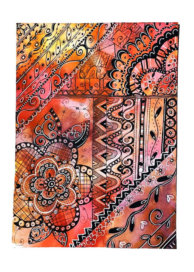 Como base del dibujo hemos usado un papel de acuarela donde hemos hecho una aguada con anilinas de diferentes colores. Una vez seco, hemos dibujado el doodle con rotulador negro de diferente grosor y hemos dado luz con rotulador blanco.