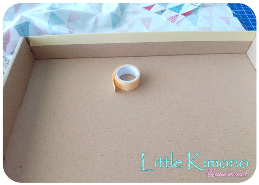 5. Siguiendo la misma técnica haremos los bordes del marco y doblando la tela por la parte de dentro de la tapa que pegaremos con cinta doble cara. Cada lateral por separado y dejando un pelín de tela más a los lados para hacer un "dobladillo" así quedará mejor ;)