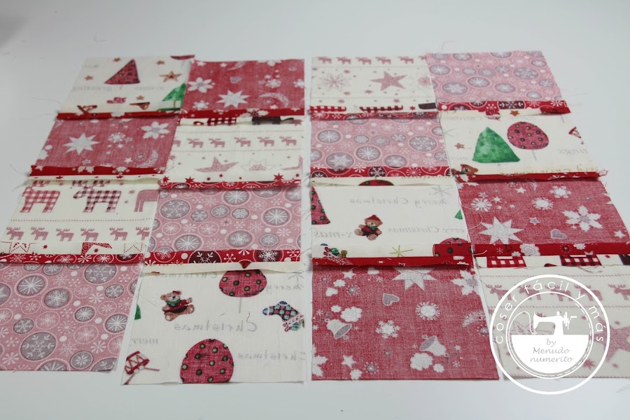 Disponemos los 16 cuadraditos de tela formando el diseño que más nos guste (en el vídeo te cuento cómo lograr un diseño equilibrado y harmonioso).
