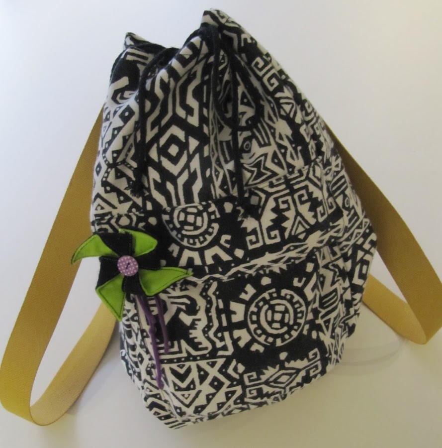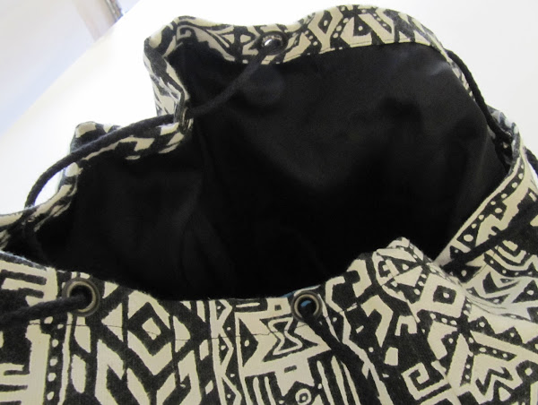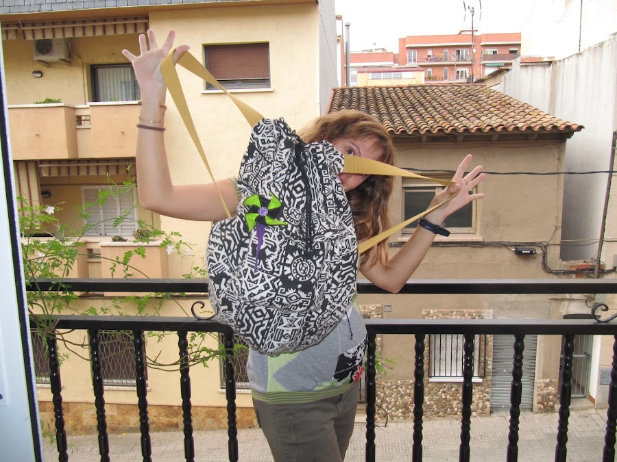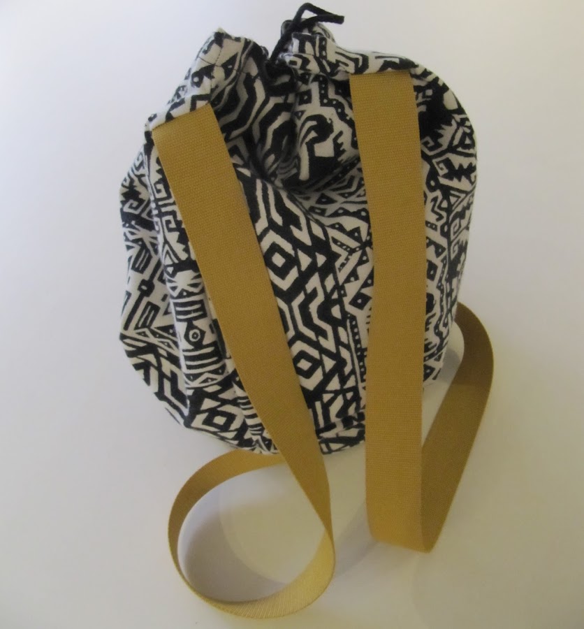 Las tiras de la mochila, para romper con tanto blanco y negro, las he puesto color mostaza. Intenté encontrar cordón del mismo color para el cierre, pero nada, seguiré buscando, de momento lo he puesto negro, ya lo cambiaré cuando lo encuentre.