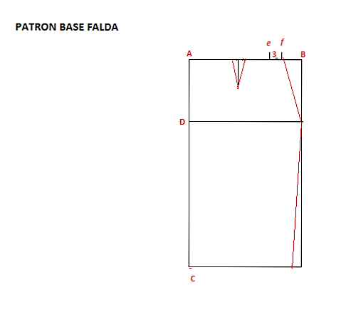 De A a e medimos 1/4 del ancho de la cintura y añadimos tres centímetros de e a f que van a ser el ancho de la pinza que hemos dibujado en el centro de A y f vamos a darle un largo de 12 cm. y la dibujas como la ves