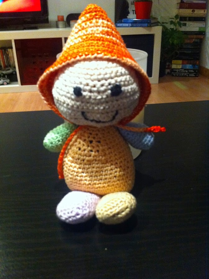 Yo, además, he añadido pelo (con hilo dorado) a la versión del bebé que os he puesto en la imagen de arriba. Finalmente, le colocamos la capucha y hacemos un lacito con la hebra sobrante.