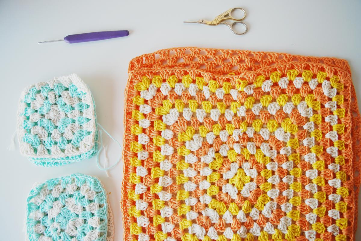 También necesitaréis 6 grannys más pequeños para los laterales. En mi caso, con una aguja del número 3 y 15 vueltas en los grannys grandes, he necesitado 3 para cada lado, pero eso dependerá del tamaño que hagáis.