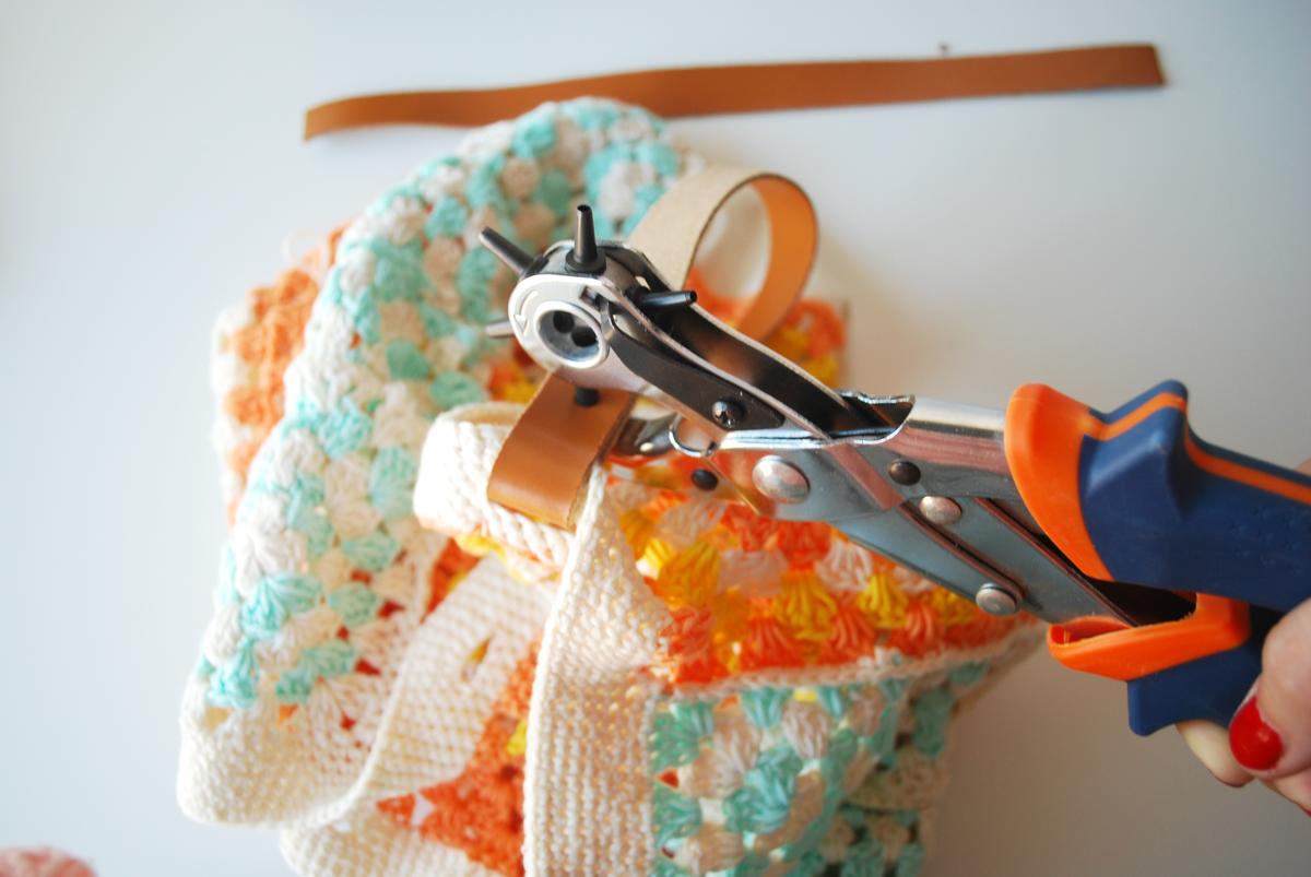 Pasamos la tira de cuero por una de las marcas que hemos hecho, la doblamos, y con la ayuda de una perforadora, haremos dos agujeros, que coseremos.