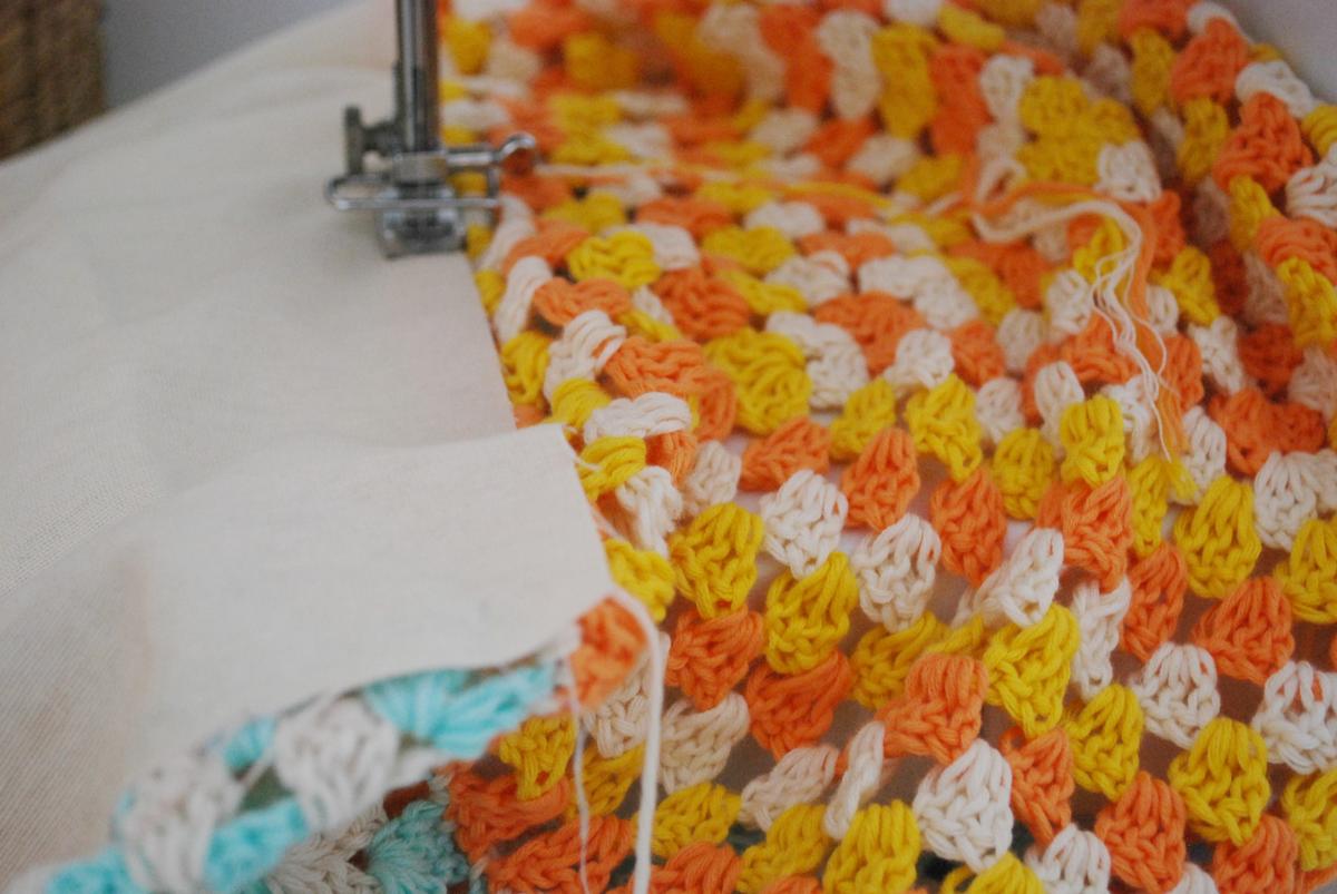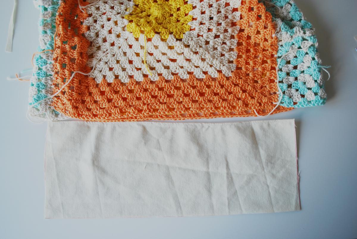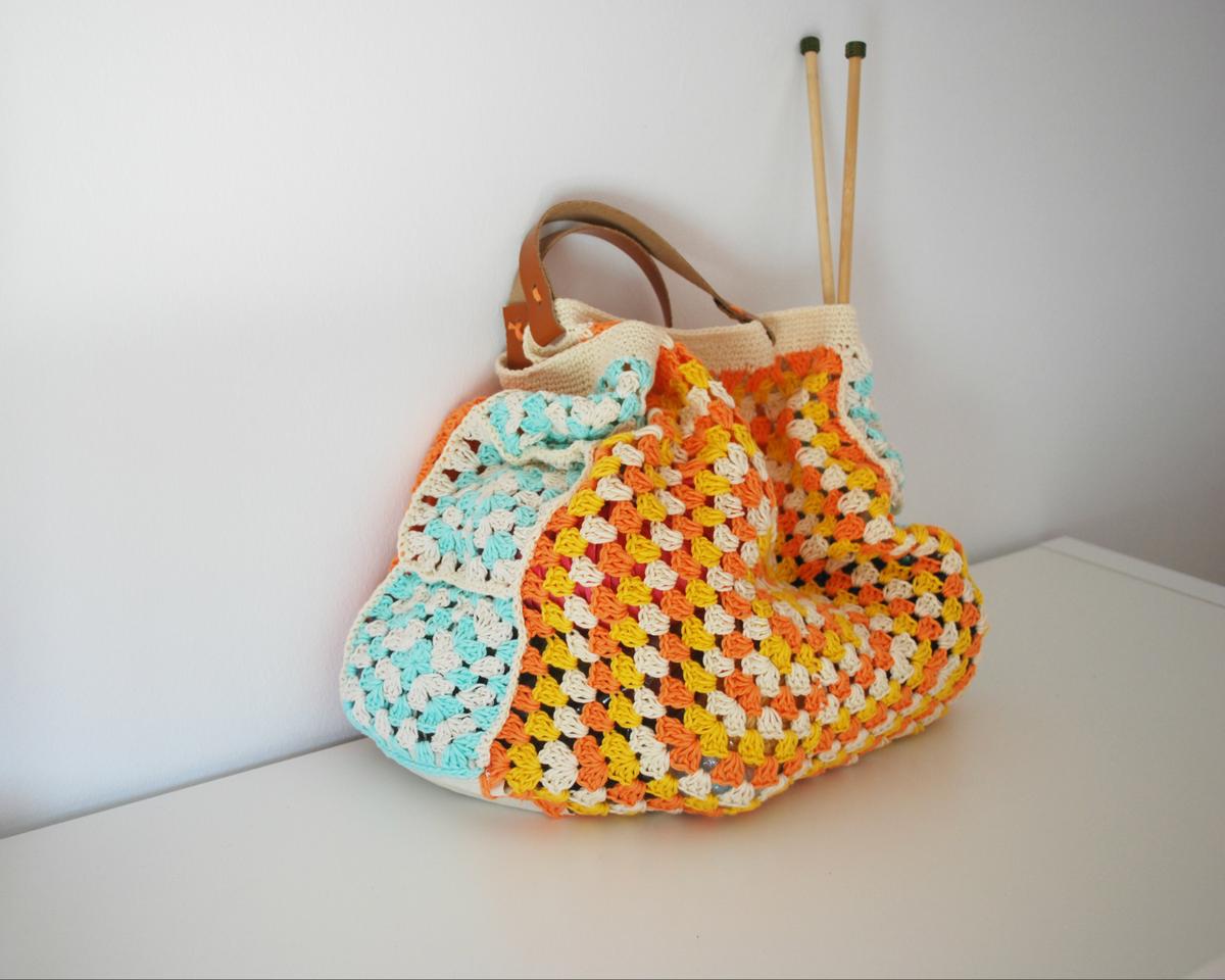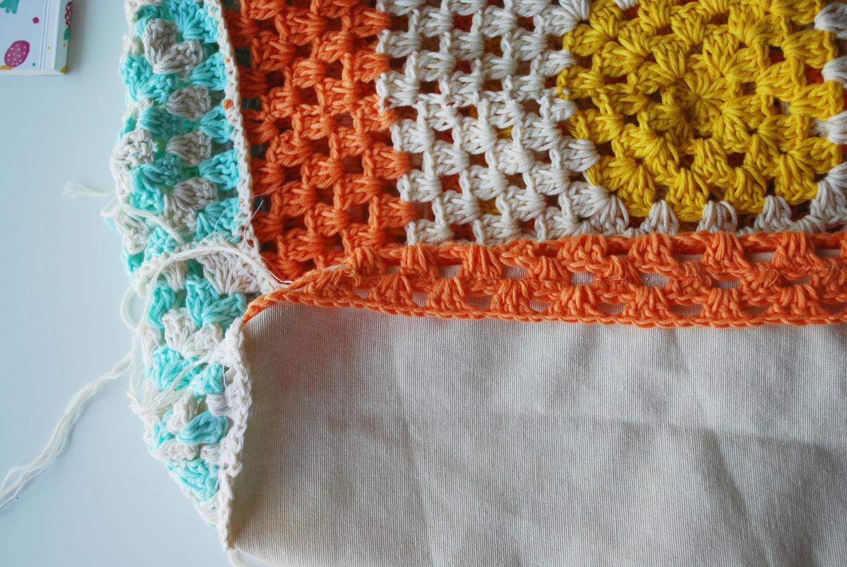 Ahora toca coser la base. Si la habéis hecho de ganchillo, la podéis unir igual que habéis hecho con los grannys o con aguja lanera. Yo como he usado un trozo de loneta, he dado la vuelta a la bolsa y he unido toda la base a la tela.