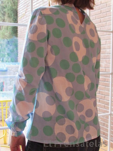 Tengo varias telas guardadas desde hace tiempo y hace unas semanas me propuse sacarlas todas e ir aprovechándolas. Total, que a ésta tela le toco el patrón de la blusa, véis que la mía no tiene cuello, lo hice, pero realmente ya era demasiado... no pegaban nada los lunarotes con los pliegues de delante y el cuello bebé. A mi me gusta como ha quedado sin él: