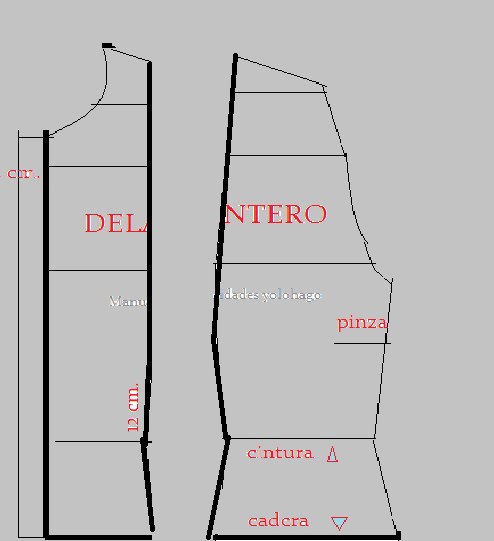 Lo primero el patrón base, te voy a explicar el delantero. Primero al rectángulo inicial ponemos el largo de la camisa, pero también marcamos el largo del talle donde dibujaremos la pinza con 3 cm. de profundidad y de largo hacia arriba 12 cm. y hacia la cadera hasta el bajo, en este centro de pinza alargamos hacia el hombro que va a formar la linea del costadillo por donde vamos a cortar el patrón, esta costura es luego la que nos dará esa forma entallada tan bonita.