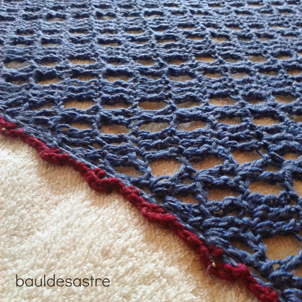 Para darle color y resaltar el azul, elegimos una madeja de Drops Cotton Merino en color Borgoña 07, y realicé el esquema del patrón, y después añadí otra vuelta más, pues parecía poco.